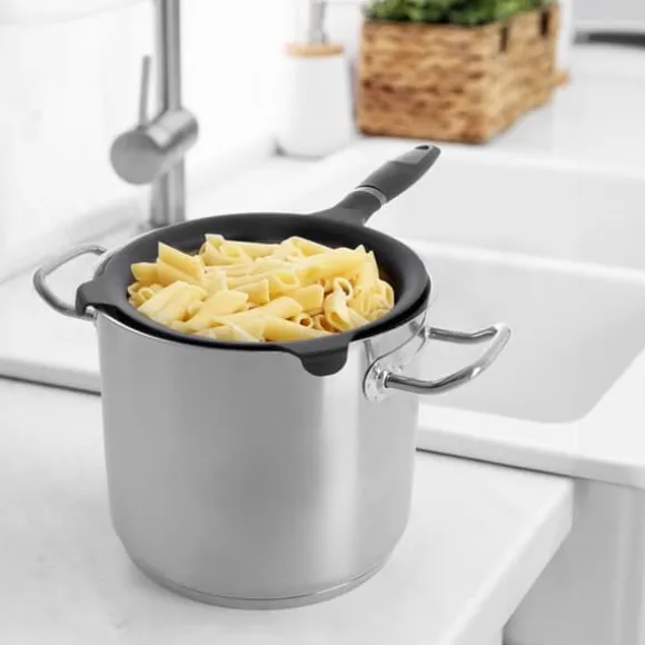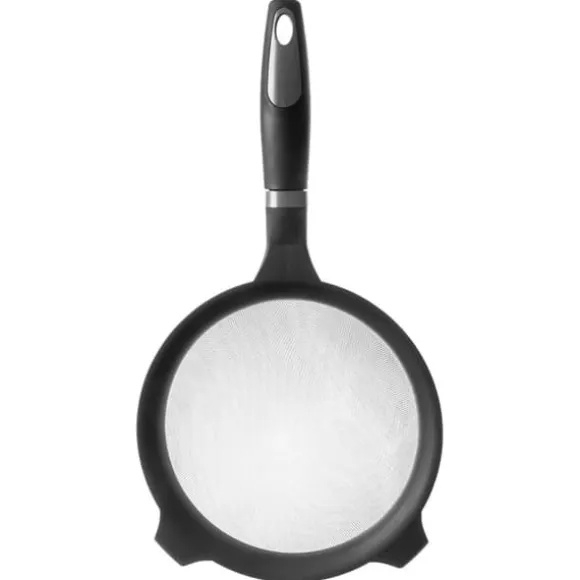 - Bekvämt handtag– Silen har ett långt, ergonomiskt handtag för bekväm användning och två kortare handtag för en stabil bas på en kruka eller skål. Den kan även bekvämt hängas på en köksskena.