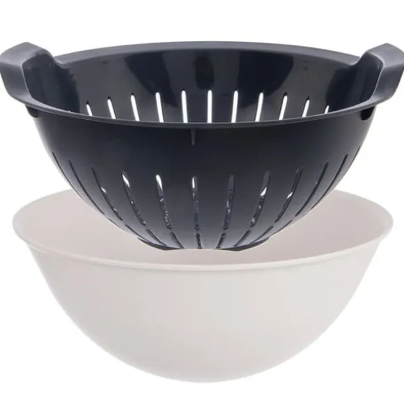 - 2-i-1 skål och sil set– Det här praktiska skål- och silsetet gör det enkelt att skölja och rinna av frukt, grönsaker, pasta eller potatis. Silen kan tas bort, maten sköljas och sedan placeras tillbaka i skålen, så att överflödigt vatten kan rinna fritt. Skålen har en diameter på 25 cm, en höjd på 10,5 cm och en kapacitet på 3 liter. Silen mäter 26 x 25 x 12 cm. Denna produkt är från Ela-serien.