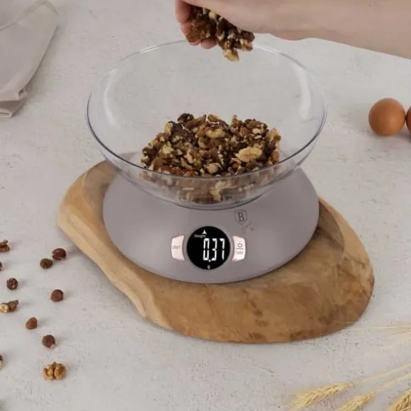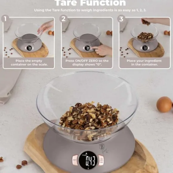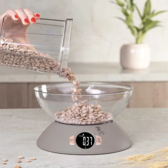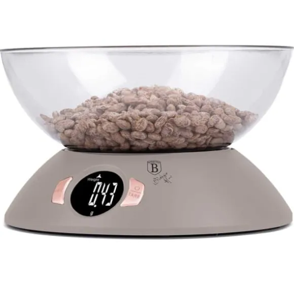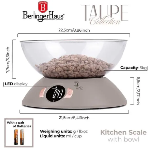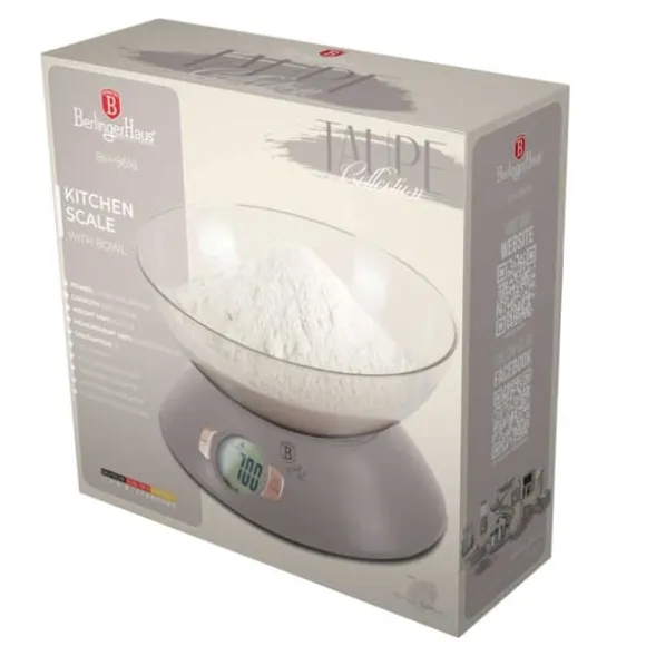 Köksvåg med skål BERLINGER HAUS. Praktiskt och estetiskt i färgerna i Taupe Collection-linjen. Vågens känslighet är 1g och den maximala vikten är 5kg. Avläsningarna visas på en stor skärm. bakgrundsbelyst LCD flytande kristallskärm. Den har en mycket bekväm automatisk nollställningsfunktion och en tarafunktion. Det innebär att ingredienser kan läggas i en skål och vägas upp lite i taget utan att ta bort de ingredienser som redan finns där. Vågen låter dig mäta vatten och mjölk i milliliter eller koppar. Knappar med peksensorteknik. Denna modell kännetecknas av estetiskt utförande och högkvalitativa material. Vågen kan användas med eller utan någon behållare. Funktioner: Maximal belastning: 5000g Vågkänslighet: 1g Bakgrundsbelyst LCD-skärm Autoåterställningsfunktion Automatisk avstängning Tarafunktion 2 x AAA batteridriven (ingår) Vägenheter: g / lb / oz / kg Vätskeenhet för vatten eller mjölk: ml / kopp Material: ABS-plast Färg: grå / transparent Mått: 1,5 x 2 Skålens mått: 1,5 cm2. 7,7 cm