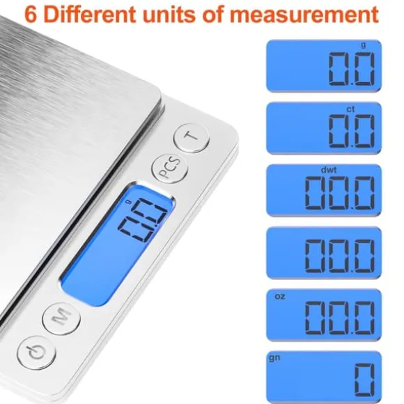 Växla enkelt mellan 6 enheter (g, ct, dwt, ozt, oz, gn) – perfekt för både recept och ädelstensvägning. Den automatiska avstängningsfunktionen sparar batteri.