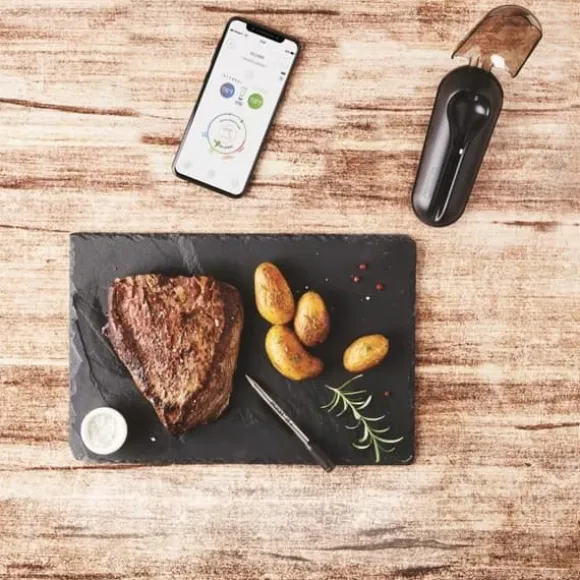 Upptäck Meat°it + steksonden, trådlös och ansluten, för att fjärrstyra tillagningen av ditt kött och fisk. Med sin mobilapplikation kan du spåra den exakta temperaturen och ta emot ljudvarningar. Den är kompatibel med olika matlagningsapparater och tål extrema temperaturer från -30°C till 400°C.