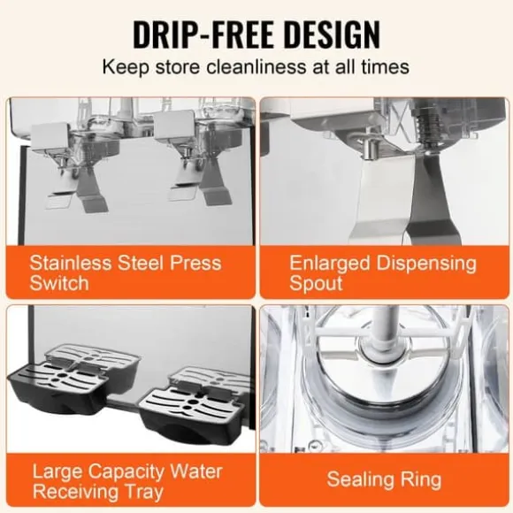 Den effektiva temperaturkontrollen säkerställer snabb kylning och hög effektivitet, med en jämn dryckestemperatur mellan 45-54°F (7-12°C). Material av livsmedelskvalitet garanterar renhet och hållbarhet, med en robust konstruktion av PC-tanken och rostfritt stål. Användarvänlig design med tryckknapputmatning och säkerhetsfunktioner för bekväm användning. Bred användning för olika dryckestyper gör den mångsidig och lämplig för olika miljöer.