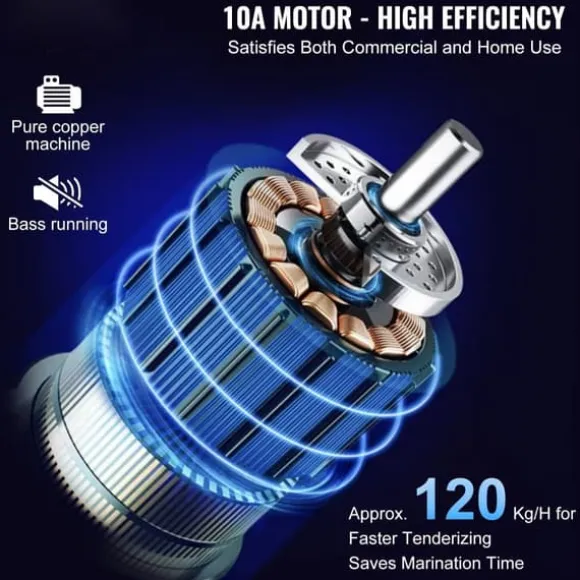Vår elektriska köttbankare är utrustad med en kraftfull 450-watts motor som gör det möjligt att snabbt och jämnt mörna kött. Den arbetar med en effektivitet på upp till 120 kg/h, vilket avsevärt minskar dina arbetskostnader och effektivt förkortar marineringstiden.