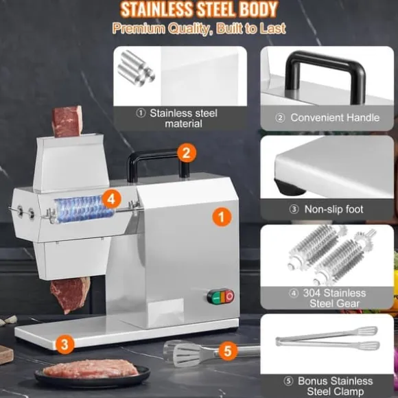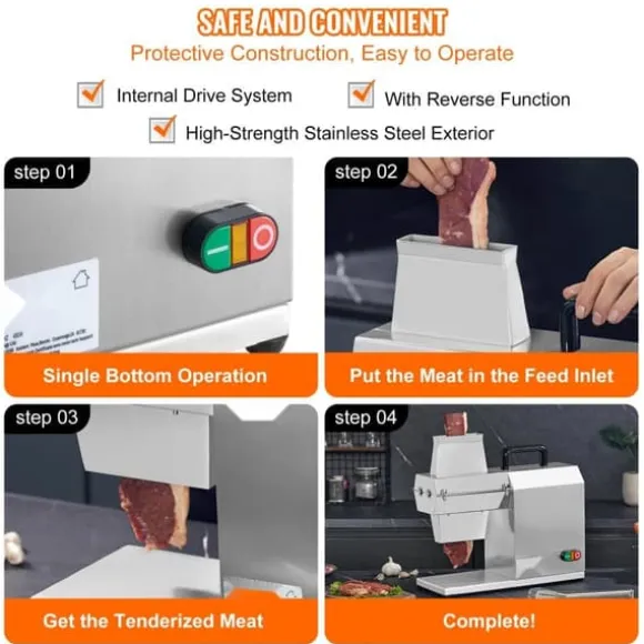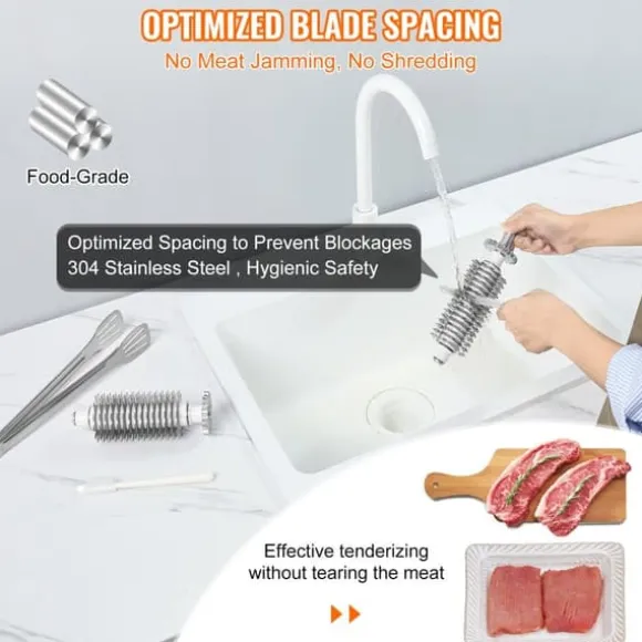 Denna köttbankare har 54 rostfria precisionsblad som ger mörhetsresultat av kommersiell kvalitet för en fylligare köttstruktur. Det optimerade avståndet mellan bladen förhindrar att köttet fastnar.