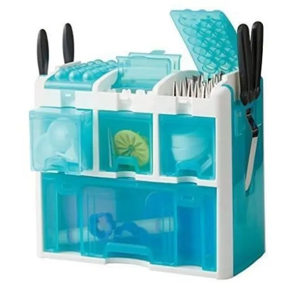 Upptäck denna kompletta uppsättning av 263 tårtdekoreringsverktyg, perfekt för alla nivåer. Den innehåller en blå och vit förvaringslåda med 4 genomskinliga lådor och 2 fack för munstycken och spatlar. Praktisk och funktionell, den är gjord av plast och metall.