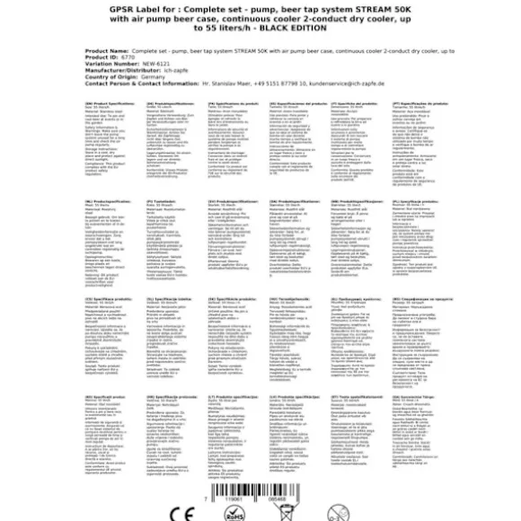 Öltapp, öldispenser, ölmaskin, ölautomat, ölkylare, öltappingssystem – Komplett set, STREAM 50K 2-rörs rostfritt stål, 55 liter/h, med membranpump – BLACK EDITION Kapacitet: 50 liter/h Redo att användas inom 2-4 min Öltappning 2 tappkranar med kylning Kyltekniken är i genomsnitt 45% mer effektiv Med den kompletta uppsättningen dispenseringssystem STREAM 50K BLACK EDITION kan du njuta av kall, nytappad öl när som helst. Öldispensern är idealisk för både privat och kommersiell användning och med dess kapacitet på upp till 55 liter per timme kan du servera en mängd olika ölsorter och -märken till dina gäster. Fördelar i korthet: •Kontrollintervall från +2 till +10 grader ger dig precision när det gäller ölets temperatur•Utgång på 55 L/h vid 10°C TD så att du kan servera många gäster utan avbrott•Kyltekniken är 45 % effektivare vilket sparar på energin och är bättre för miljön•Snabb igångsättning, komplett setet är klart för användning på bara 2-4 minuter•Ingen CO2-användning krävs tack vare en integrerad luftpump som säkerställer en enkel och mobil dispensering•Kylningen går hela vägen till kranen vilket ger dig en perfekt kyld öl•Kylslingorna, som är gjorda av rostfritt stål, är stabila och hållbara•Högkvalitativ utförande och förpackning av den eleganta svarta STREAM 50K BLACK EDITION•Kylkapaciteten på upp till 90 glas (0,5 liter) utmärkt kyld öl per timme ger en perfekt balans mellan kapacitet och kvalitet•Komplett set med dispenser, öllåda, flödeskylare, torrkylare, tryckluftsslang och ölslang gör det enkelt och praktiskt att installera och använda Tack vare den integrerade luftpumpen kan du använda Öltapp och tappra din öl var som helst, utan krångel. Oavsett om det är en trädgårdsfest, en grillkväll eller en sportevenemang, har du alltid kall, fräsch öl på plats. Använd STREAM 50K BLACK EDITION i restaurangen, på puben eller i din egen bar hemma. De eleganta svarta dispenserarna passar i alla miljöer och ger din inredning en extra touch av stil och modernitet. Med Öltapp, Ölmaskin – Komplett set, 50/K 2-rörs rostfritt stål, 50 liter/h, med membranpump kan du nu servera öl som en proffs och samtidigt njuta av den högsta kvaliteten och prestanda.