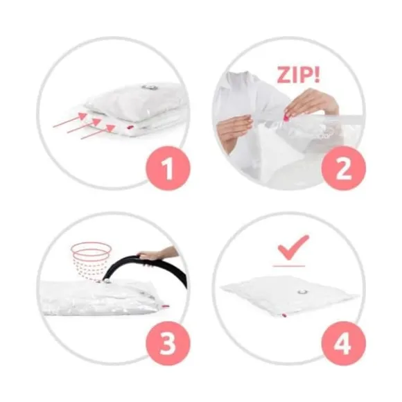 Upptäck setet med 5 COMPACTOR kompressionspåsar, perfekta för att optimera utrymmet. Finns i storlek M och L, de är transparenta och tillverkade av nylon och polyeten. Perfekta för effektiv förvaring, dessa påsar är avsedda för vuxenbruk och är kompatibla med vakuumförvaring.