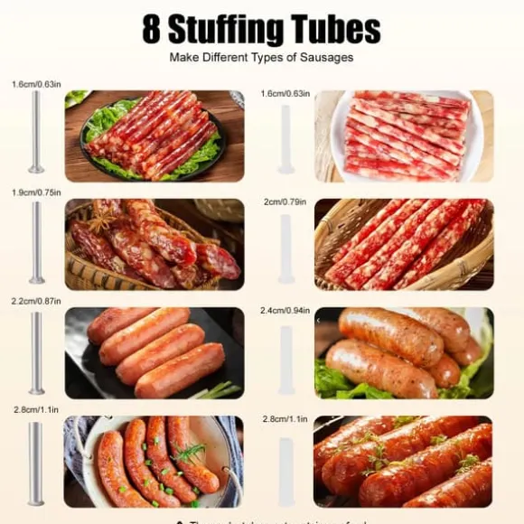 - 6 rörstorlekar i plast och rostfritt stål för olika korvtyper
