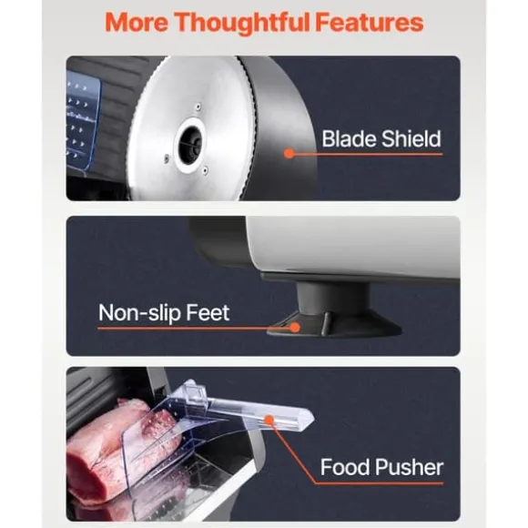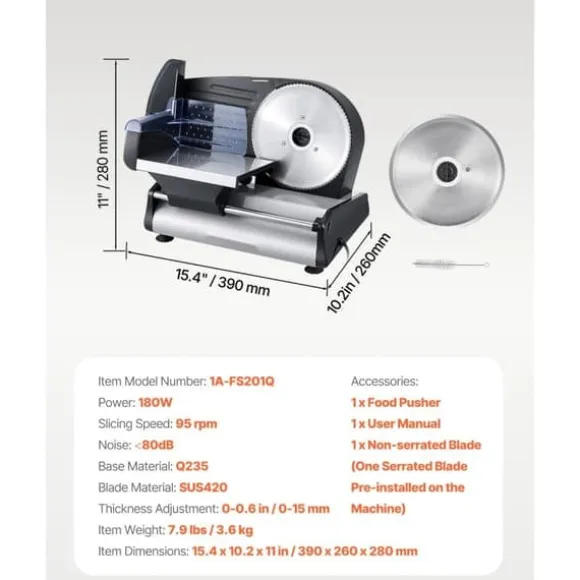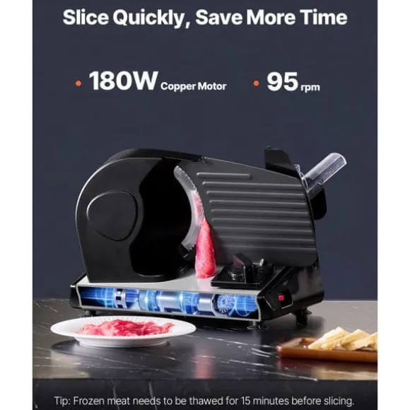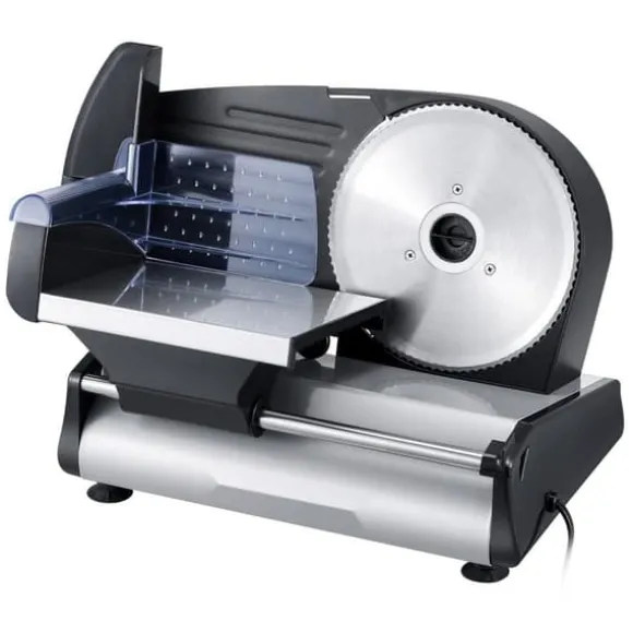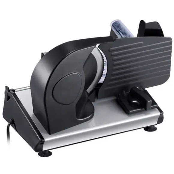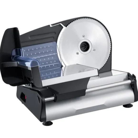 Denna köttskärare har ett uppgraderat 7,5″ brett blad i rostfritt stål som enkelt hanterar olika mattexturer som fryst kött, ost, skinka och bröd.