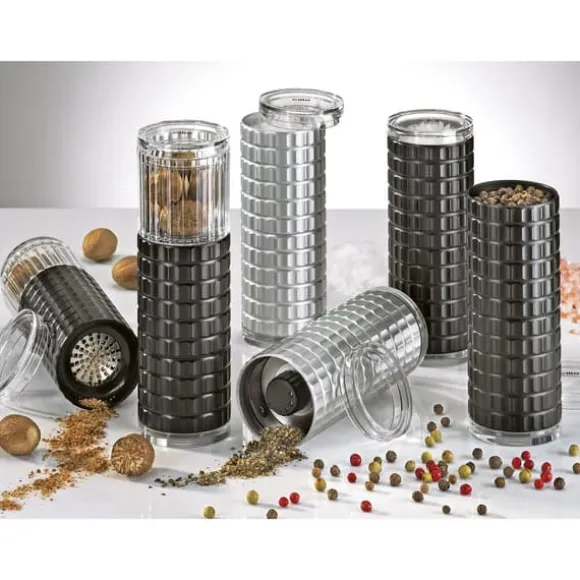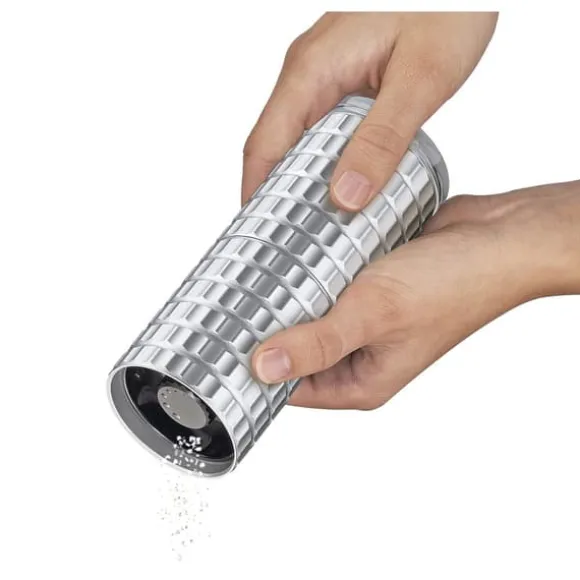 Kryddkvarn i aluminium med keramisk malningsmekanism. * Lämplig för pepparkorn, bergsalt och torkade örter * Transparent lock gör det enkelt att identifiera innehållet * Aluminiumhölje med modernt utseende och konvext mönster för enkel användning * Locket förhindrar att kryddrester spills ut, vilket hjälper till att hålla ordning på bordet och i skåpet * Hård, keramisk malningsmekanism som är nötnings- och korrosionsbeständig, skärvorna håller sig vassa länge * Steglös justering av malningsfinheten * Malningsmekanism täckt av 10 års garanti Mått * Diameter: 4,5 cm * Höjd: 12,5 cm Material * Aluminium * Keramik
