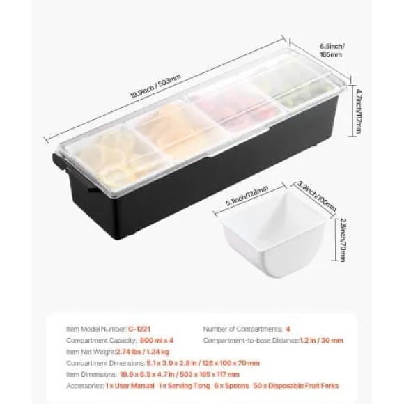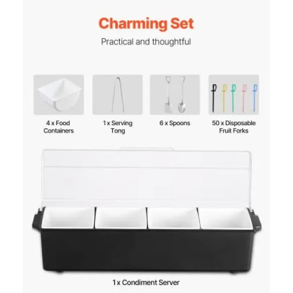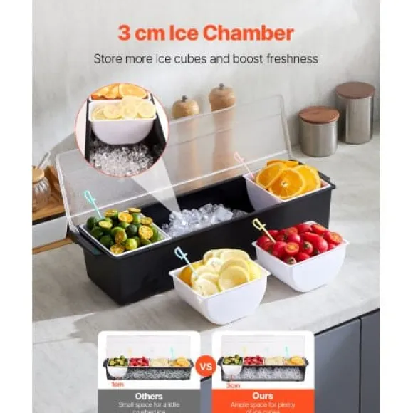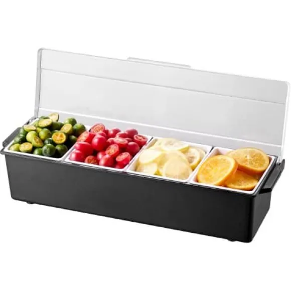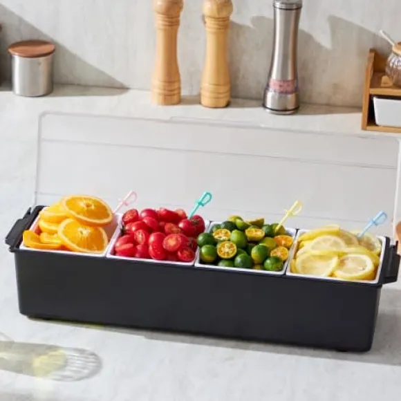 Håll dina kryddor och tillbehör fräscha och organiserade med denna kylda kryddserver, perfekt för bartending, fester och familjesammankomster. Med fyra justerbara fack och ett separat isfack håller den dina ingredienser svala och åtskilda för optimal fräschör och presentation. Den hållbara, livsmedelssäkra konstruktionen och lättstädade designen gör den idealisk för både hem och restaurang.