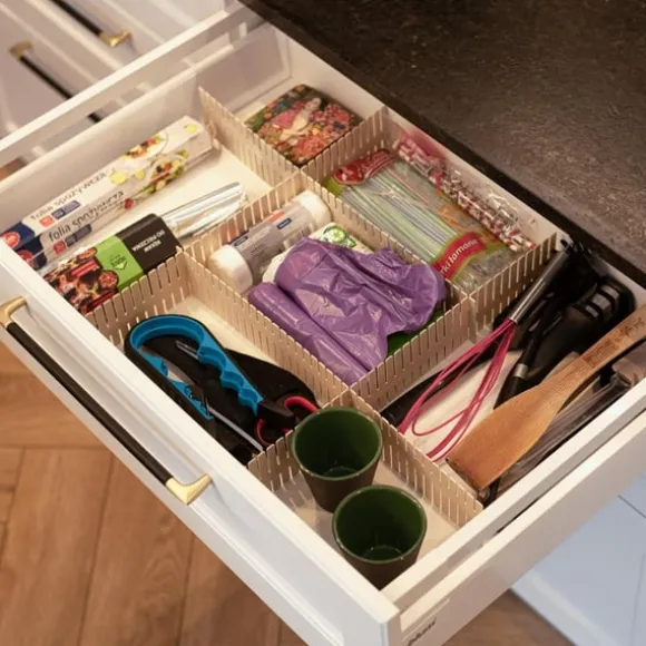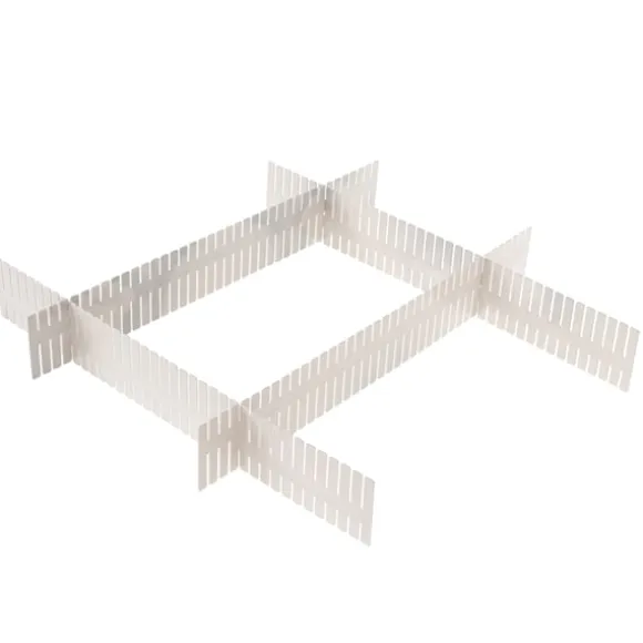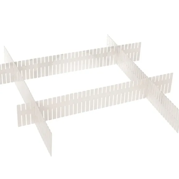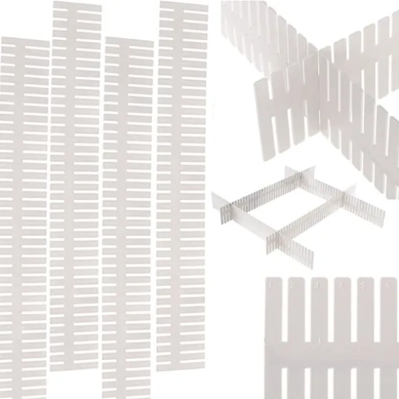 Monteringen är smidig och kräver inga verktyg – du mäter lådan, klipper till delarna i rätt längd och hakar ihop dem via förberedda hål. På så sätt får du en stabil och anpassningsbar lösning som kan justeras eller återanvändas i andra utrymmen. Materialet är enkelt att rengöra, vilket gör att avdelaren kan användas om och om igen med samma goda resultat.
