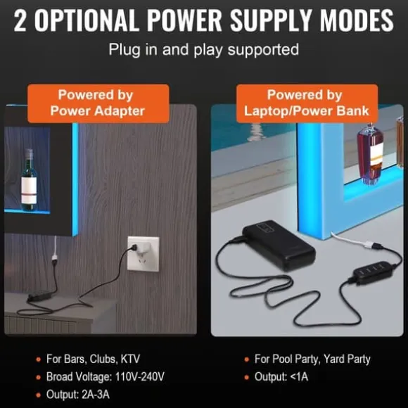 Oavsett var festen är, våra upplysta barhyllor tar aldrig slut. De kan drivas av en 110-240V strömadapter och en laptop/powerbank. Låt festen leva vidare! På grund av två strömförsörjningsmetoder kan vår produkt tillfredsställa inomhus- och utomhusaktiviteter. Ladda upp, festa och lev tills solen går upp.