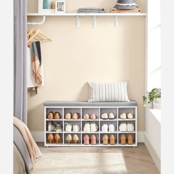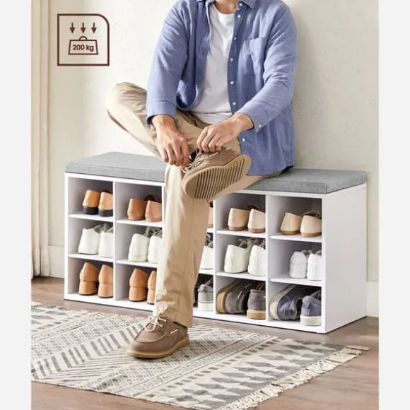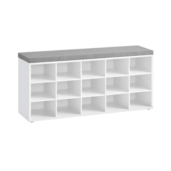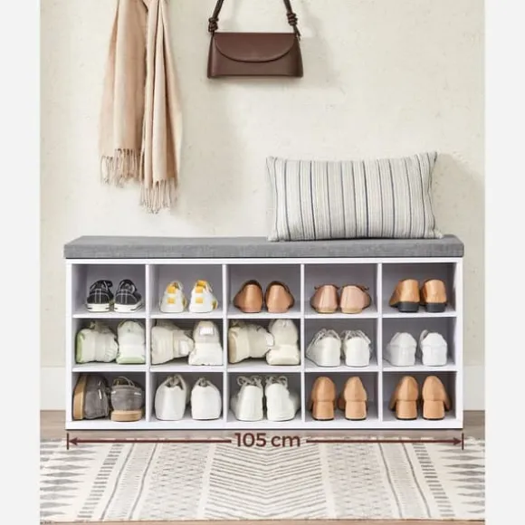 Vad du får: en vadderad skobänk för bekvämt sittande när du byter skor och 15 förvaringsfack för skor för en organiserad entré