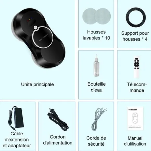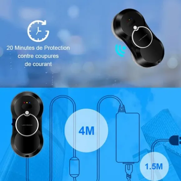 Enkel och säker att använda: Koppla in den, sätt den på fönstret och den börjar rengöra! Den rör sig metodiskt och utför en exklusiv dubbel sidogång. När rengöringscykeln är klar stannar roboten automatiskt. Helt säker, om roboten kopplas bort från sin strömkabel eller vid strömavbrott, tar backupbatteriet över i cirka 20 minuter.