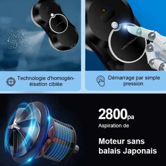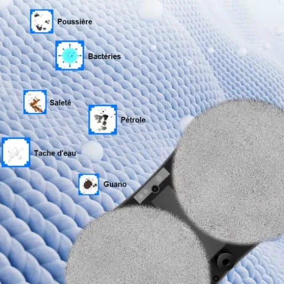 Tack vare sina två roterande dynor täckta med mikrofiberöverdrag och sin patenterade partikelsugare, absorberar och rengör den på djupet utan att lämna spår.