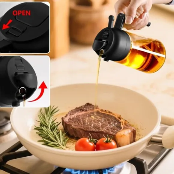 Bekväm användning: Framåtriktad spraymunstycke ger fin och jämn oljedimma utan droppar; bakre handtag gör det enkelt att hälla eller spraya och håller händerna rena för en smidig och oljefri användarupplevelse.