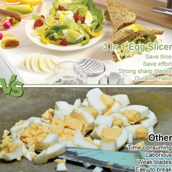 Perfekta äggskivor på några sekunder: Skär hårdkokta ägg enkelt med vassa rostfria stålvajrar och få jämna, professionella skivor varje gång. Perfekt för sallader, smörgåsar eller dekorationer – inga matlagningskunskaper behövs. Kan även tärnas, skäras i bitar eller skivas horisontellt/vertikalt, vilket ger mångsidiga alternativ för olika rätter.