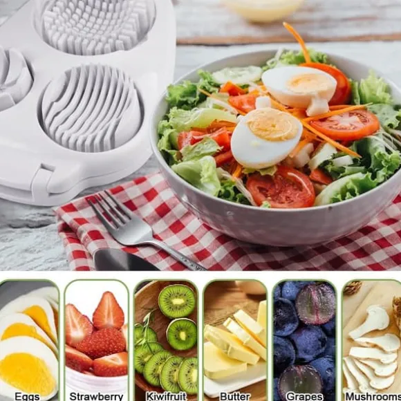Mer än bara en äggskärare: Ett multifunktionellt köksverktyg! Kan även skära banan, kiwi, ost eller tomat exakt. (Observera: undvik hårda skal som korv eller frysta ingredienser för att skydda vajrarna.)