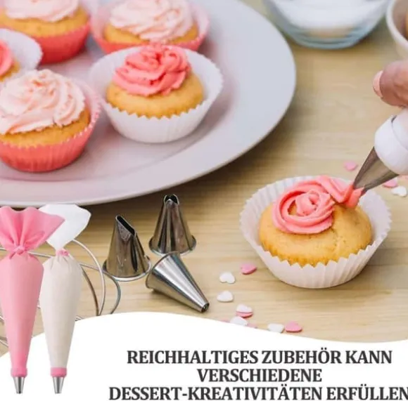 — Medföljande metallmunstycken gör det enkelt att skapa olika mönster och dekorationer. Setet innehåller även en slickepott för att jämnt breda ut smörkräm eller glasyr.