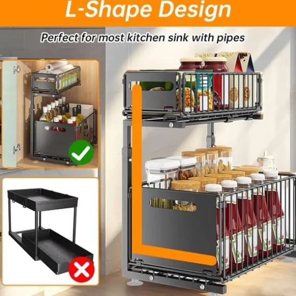 Denna underskåpshylla har en L-formad design, smal upptill och bred nedtill, vilket gör att den passar perfekt under diskbänken. Förinstallerad plats för rörledningar maximerar det vertikala