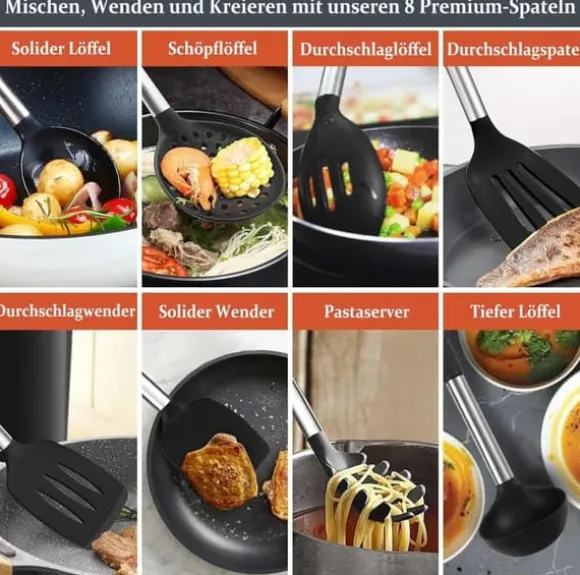 Varje köksredskap är tillverkat av premium rostfritt stål och livsmedelssäkert silikon, vilket garanterar hållbarhet och säkerhet. Silikonhuvudet skyddar din non-stick stekpanna från repor och skador, och förlänger livslängden på dina köksredskap.