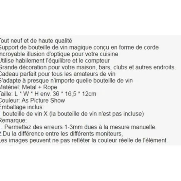 Material: Metall + Rep Soll: L * B * H ca. 36 * 16,5 * 12cm Färg: Som på bilden Förpackning ingår: 1 vinflaska X (vinflaskan ingår ej) Observera: 1. Tillåt fel 1-3mm på grund av manuell mätning. 2. Från la