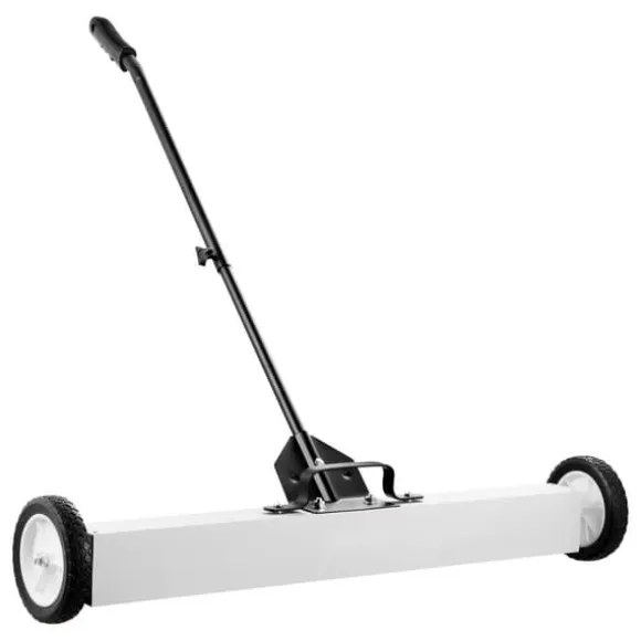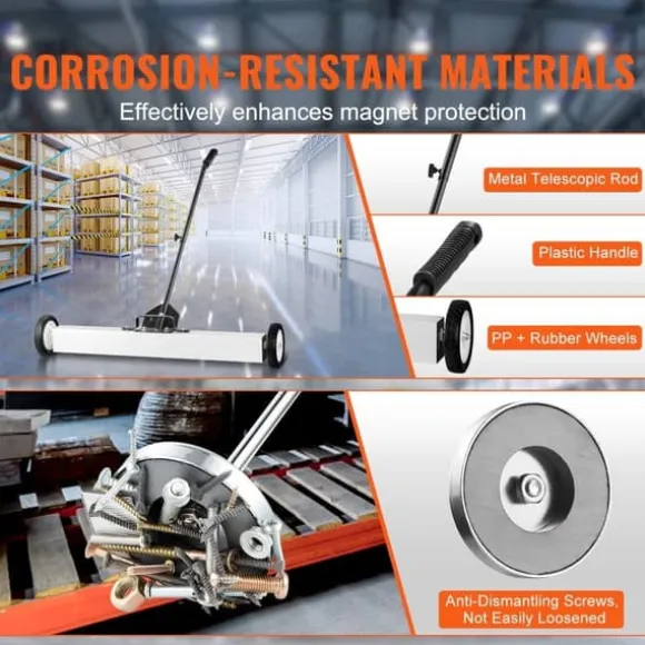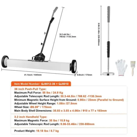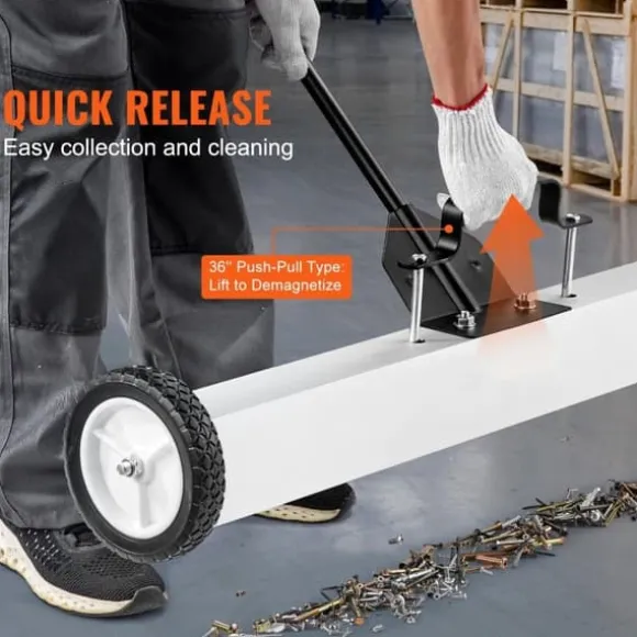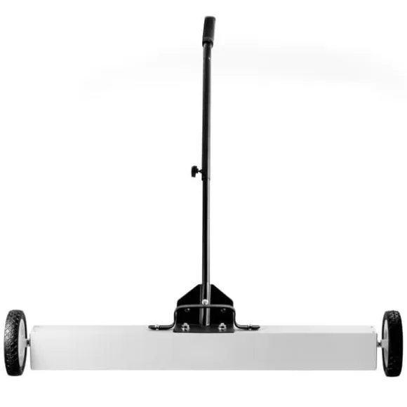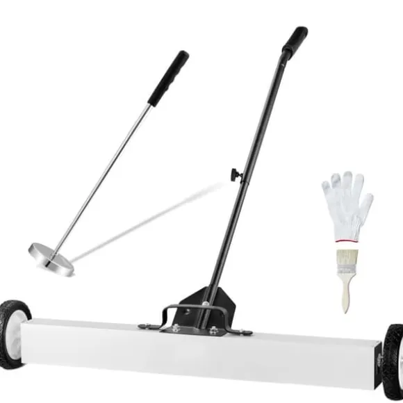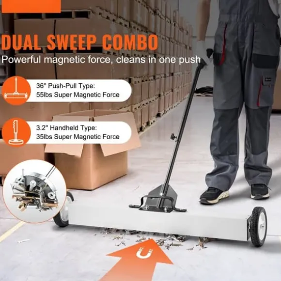 Magnetiska sopmaskinen med hjul inkluderar en 36” magnetisk sopmaskin med hjul och ett 3,2” teleskopiskt magnetiskt pickupverktyg, som kan hålla upp till 55 lbs (36”) respektive 35 lbs (3,2”). Den samlar enkelt upp spikar, skruvar och svart metallskräp och skyddar dig från skärvor och vassa metaller.