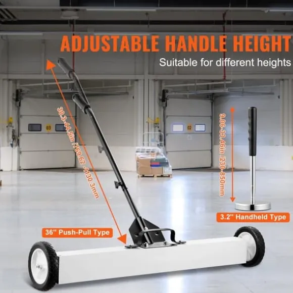 Teleskophandtaget möjliggör justerbara höjder. Den rullande magnetiska sopmaskinen på 36 tum justeras från 30,3 till 44,5 tum (769,62 – 1130,3 mm), medan det 3,2 tum teleskopiska magnetiska pickupverktyget justeras från 9,06 till 33,46 tum (230-850 mm). Säg adjö till böjtrötthet med bekväm förvaring och enkel portabilitet.