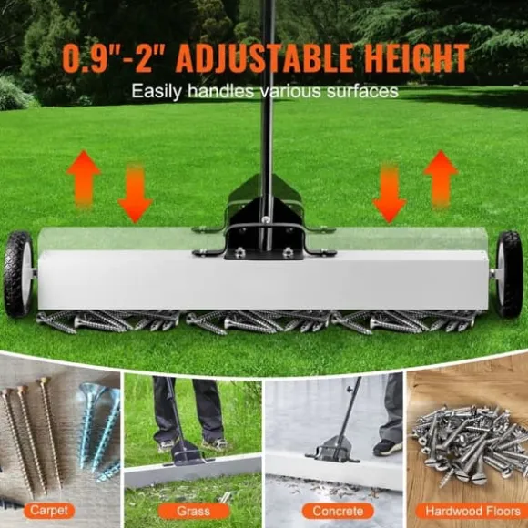 Efter att ha lockat till sig magnetiska föremål, lyft och släpp helt enkelt handtaget för snabb bortskaffande av skräp. Alla uppsamlade metallpartiklar kommer omedelbart att falla, vilket möjliggör snabb rensning. De 6,89-tums gummihjulen är höjdjusterbara från 0,9” till 2” (22,86 – 50,8 mm), vilket gör magnetsoparen lätt att manövrera över grus- och gräsytor. Den innehåller en borste och handskar för extra bekvämlighet.