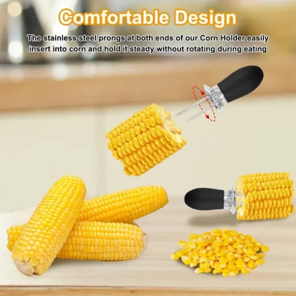 Rostfria stålspett tränger enkelt igenom majskornen och förhindrar vridning. Värmebeständiga plasthandtag med en texturerad, halkfri design som förblir sval vid beröring. Sammankopplad förvaringsdesign skyddar effektivt den vassa spetsen när den inte används.
