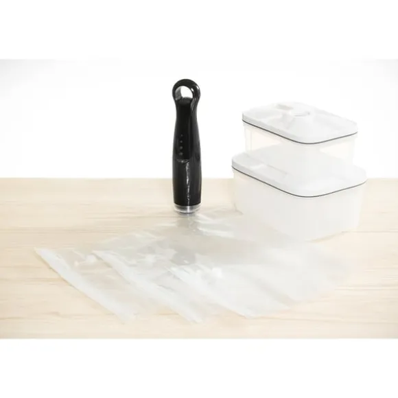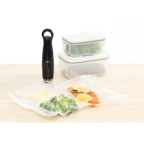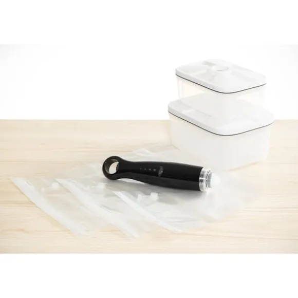Den kompakta vakuumförslutaren är lätt att använda, rengöra och förvara. Du kan skapa ett vakuum med en knapptryckning.