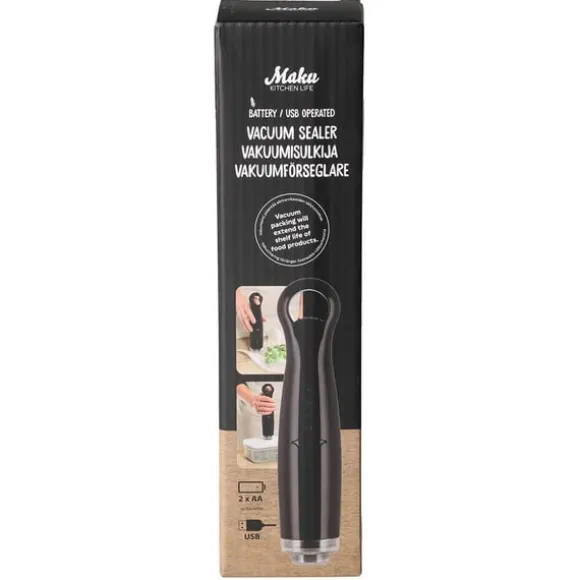 Lämplig för användning med vakuumbehållare och påsar, t.ex. 602525 Maku Vacuum matbehållare och Maku Vakuumpåsar L–S 602527, 602528 och 602529. Använder 2 x AA-batterier (ingår ej) eller en USB-kabel 1 m (ingår). Spänning: DC 3–5 V. Effekt: 2–6 W.