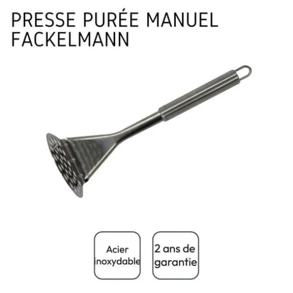 BESKRIVNING: Fackelmann erbjuder denna potatispress från kollektionen Elemental, helt i rostfritt stål, som kommer att hjälpa dig att göra hemlagade puréer med potatis, morötter, sötpotatis med mera. ANVÄNDNINGSTIPS: Vår potatispress tål inte diskmaskin, tvätta den för hand för längre livslängd. SAMMANSÄTTNING: Rostfritt stål. DIMENSIONER: 25,5 x 8,3 x 8 cm. INNEHÅLL: 1 manuell potatispress. Fackelmanns manuella potatispress är helt i rostfritt stål och låter dig krossa dina potatisar och grönsaker för att göra hemlagade puréer. Elektriska mixrar tenderar att göra purén för rinnig, och om du gillar att behålla några bitar av grönsaker i din puré, är denna professionella grönsakspress perfekt för dig! Fackelmann France är ett företag som specialiserar sig på distribution av köks- och bakverktyg samt bakformar och ugnsplåtar. Företaget strävar efter att göra matlagningen enklare för alla med sina smarta redskap. Fackelmann Frances köksredskap erbjuds till alla typer av kockar för enkel och daglig användning. Vispar, spatlar, slevar, skalare, skärbrädor och mycket mer finns tillgängliga för att förbereda läckra och alltmer originella recept.
