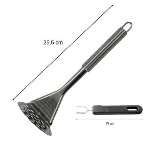 DIMENSIONER: Potatispressen mäter 25,5 cm i längd; med den behöver du inga många redskap för att göra en puré; den tål inte diskmaskin, men är lätt att tvätta för hand; gaffeln med tre tänder mäter 14 cm i längd.