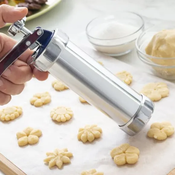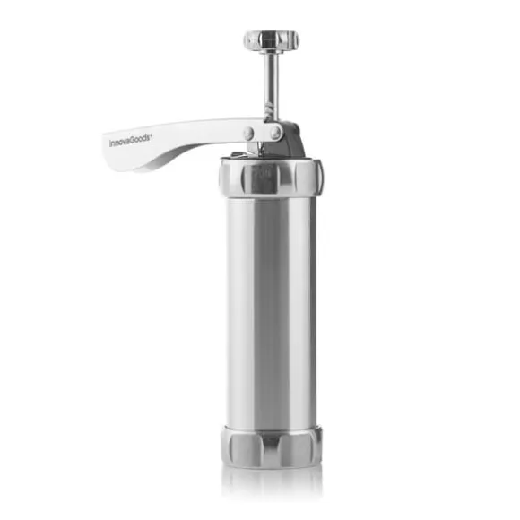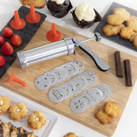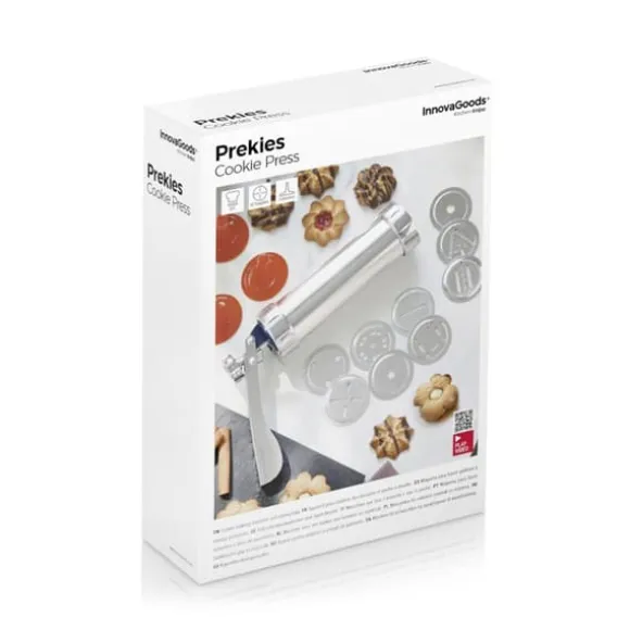 En maskin för att göra kakor som också används som spritspåse, vilket sparar tid, ansträngning och utrymme i köket, tack vare sin multifunktionella designen 2-i-1. Detta är ett manuellt redskap för bakverk som är mycket enkelt att använda och som gör att du kan baka läckra och originella kakor med naturliga ingredienser hemma och tillsammans med din familj. Perfekt för barn och vuxna för att roa sig och utveckla all sin kreativitet på bakbordet och ha trevligt tillsammans med familjen när de bakar och dekorerar sina egna kakor, vilket också bidrar till en mer hälsosam och sund kost. Detta multifunktionella spritsrör och spritspåse med ergonomiskt handtag har en cylindrisk form och lämpar sig för kakdeg, grädde, choklad, kräm m.m. Det medföljer 20 mallar för att göra kakor med olika former och 4 munstycken för olika slags dekorationer av kakor, bakelser, tårtor m.m. Dessutom är det enkelt att montera isär för rengöring. Bruksanvisning och ett grundläggande recept på kakdeg medföljer.
