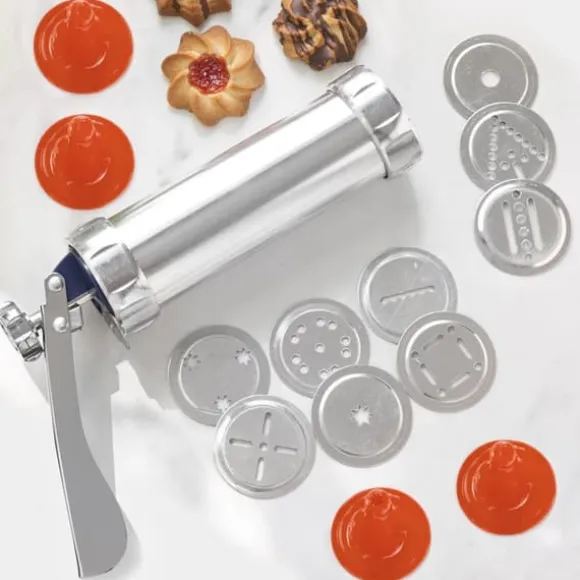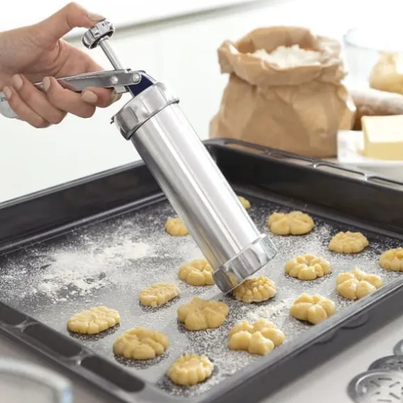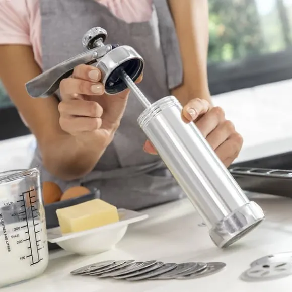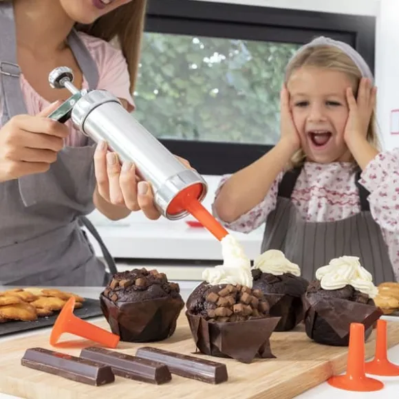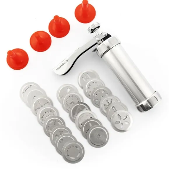 En maskin för att göra kakor som också används som spritspåse, vilket sparar tid, ansträngning och utrymme i köket, tack vare sin multifunktionella designen 2-i-1. Detta är ett manuellt redskap för bakverk som är mycket enkelt att använda och som gör att du kan baka läckra och originella kakor med naturliga ingredienser hemma och tillsammans med din familj. Perfekt för barn och vuxna för att roa sig och utveckla all sin kreativitet på bakbordet och ha trevligt tillsammans med familjen när de bakar och dekorerar sina egna kakor, vilket också bidrar till en mer hälsosam och sund kost. Detta multifunktionella spritsrör och spritspåse med ergonomiskt handtag har en cylindrisk form och lämpar sig för kakdeg, grädde, choklad, kräm m.m. Det medföljer 20 mallar för att göra kakor med olika former och 4 munstycken för olika slags dekorationer av kakor, bakelser, tårtor m.m. Dessutom är det enkelt att montera isär för rengöring. Bruksanvisning och ett grundläggande recept på kakdeg medföljer.