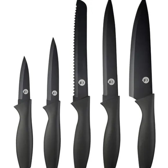 Detta Mästerkocken knivset från den populära tv-serien Mästerkocken är det perfekta valet för både amatörer och professionella hemmakockar. Tillverkat av högkvalitativt rostfritt stål med svarta handtag och blad som ger detta knivset en proffsig look samtidigt som det är snygga i köket. Varje kniv har ett ergonomiskt handtag för ett säkert och bekvämt grepp. Knivarna har en non-stick-beläggning som underlättar skärningen.