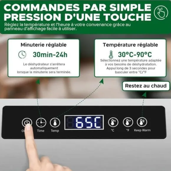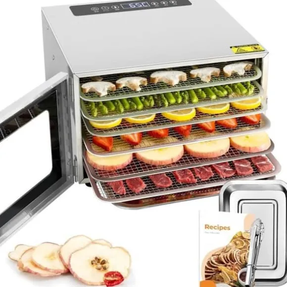 Kwasyo livsmedelstork i rostfritt stål med 6 nivåer, med 24 timmars timer och justerbar temperatur från 30 till 90°C. Idealiskt för att torka frukter, grönsaker och kött. 2 års garanti, lätt att rengöra och säker med skydd mot överhettning.