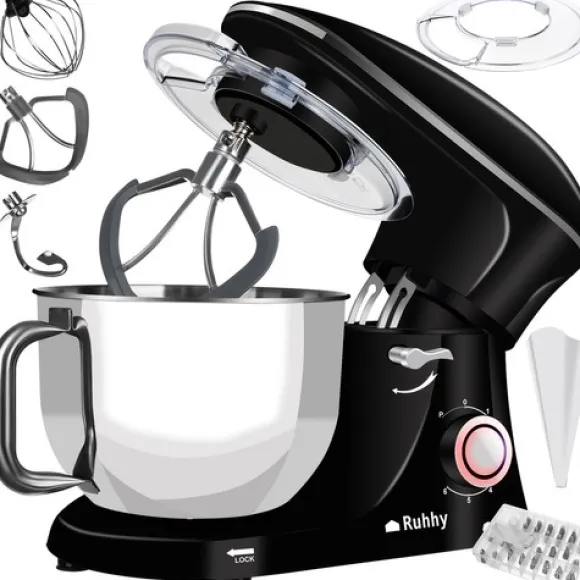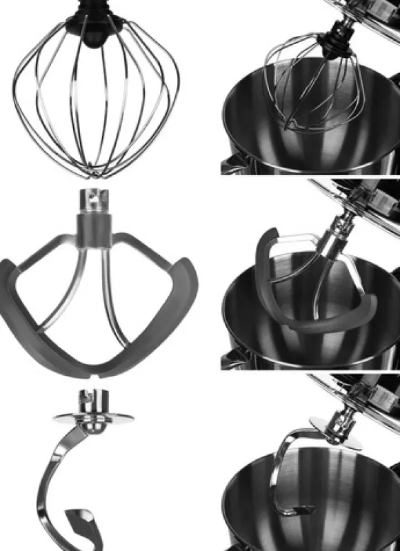 - Medföljer: Matberedare, skål, degkrok, flatvisp, visp, stänkskydd, spritspåse med 24 dekorativa spetsar i låda