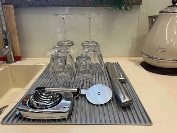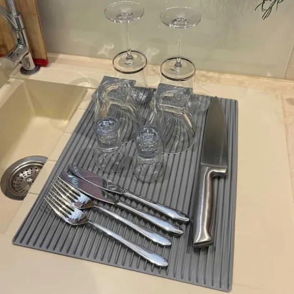 Disktorkmattan fungerar som ett torkställ. Material: Polypropen Mått: 39 x 31 cm Detaljer: – En praktisk matta som kan användas som avlopp för disk – Den fungerar perfekt istället för ett traditionellt torkställ. – Lätt att rengöra. – Färg: grå