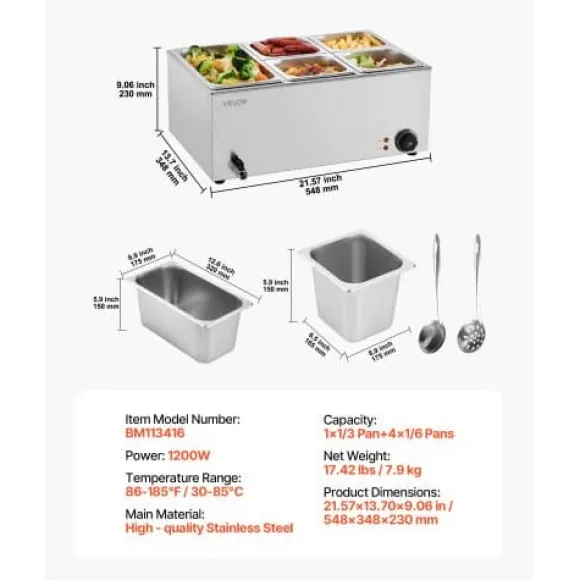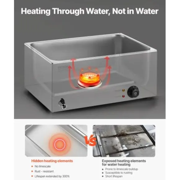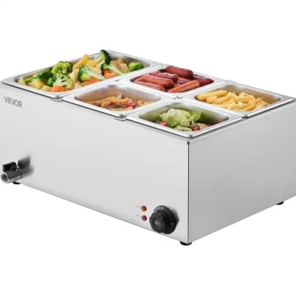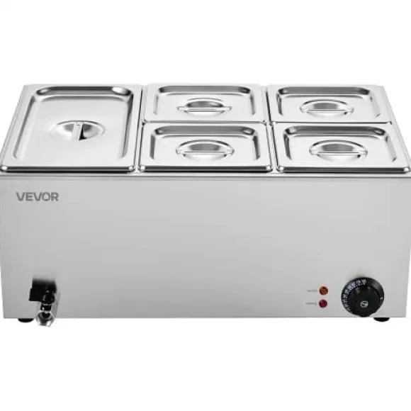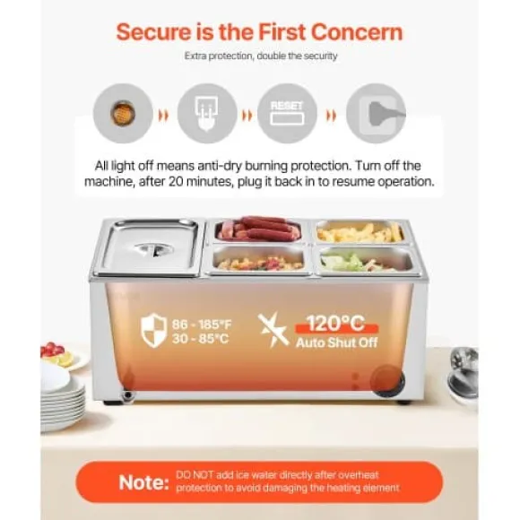 Denna kommersiella matvarmhållare är utformad för professionell catering, bufféer, fester och restauranger, och erbjuder effektiv uppvärmning samt pålitlig temperaturkontroll för att hålla flera rätter varma och serveringsklara. Den robusta konstruktionen i rostfritt stål säkerställer hållbarhet och enkel rengöring, medan säkerhetsfunktioner som torrkokningsskydd ger extra trygghet vid användning. Enheten inkluderar fem separata behållare, vilket gör den idealisk för att servera olika maträtter samtidigt.
