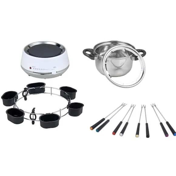 Den här elektroniska fonduen är tillverkad i rostfritt stål och har justerbar temperaturkontroll, så att du enkelt kan kontrollera värmen. Fonduen är på 1200W och värms upp snabbt och gör det enkelt och snabbt att förbereda maten. I den medföljande roterande ringen med 6 såsskålar finns det plats för många