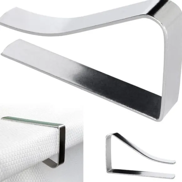 Metallklämma för bordsduk. Håller duken perfekt på bordsskivan och förhindrar att den glider. Den kommer att vara användbar i alla hem, trädgårdar, terrasser eller balkonger. Oumbärlig vid blåsigt väder under utomhusfester eller picknickar. Denna praktiska, hållbara klämma säkerställer ett stabilt grepp för duken och skyddar bordsservisen från att glida och falla. Tillverkad i enlighet med europeiska standarder.