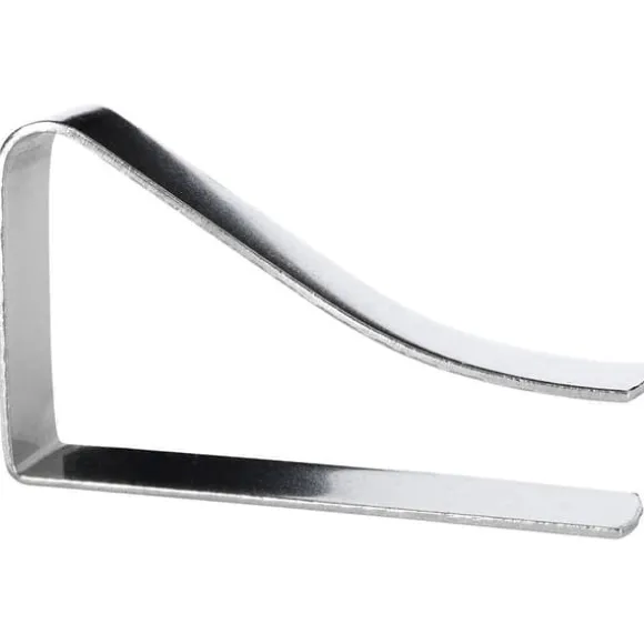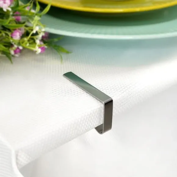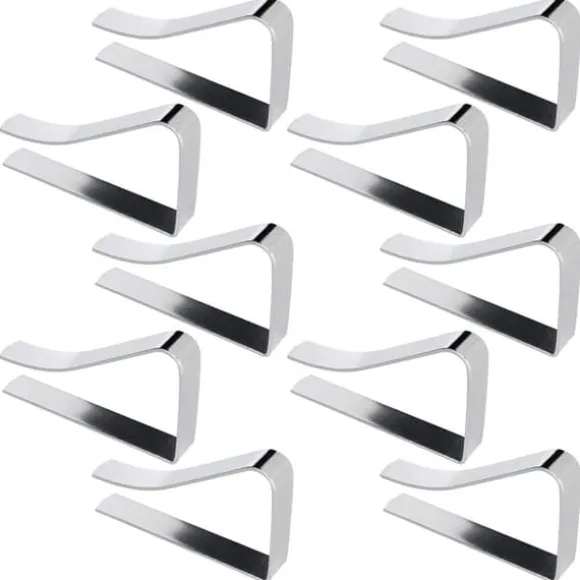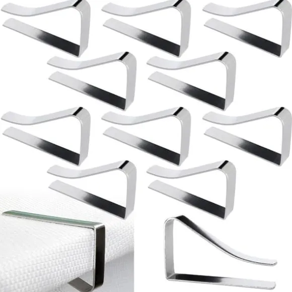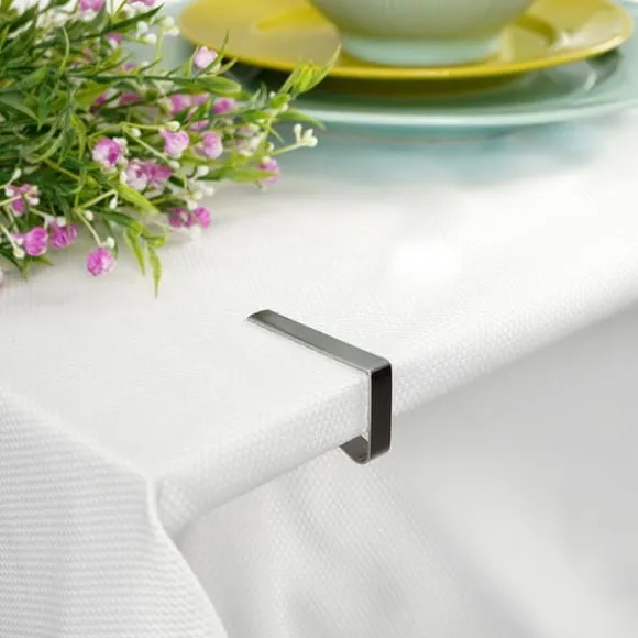 Bordsduksklämmor i metall, 10 stycken. De håller duken perfekt på plats på bordsskivan och förhindrar att den glider. De kommer att vara användbara i alla hem, trädgårdar, terrasser eller balkonger. Oumbärliga vid blåsigt väder under utomhusfester eller picknickar. Praktiska, hållbara klämmor säkerställer ett stabilt grepp för duken, vilket skyddar bordsartiklar som placeras på den från att glida och falla. Tillverkad i enlighet med europeiska standarder.