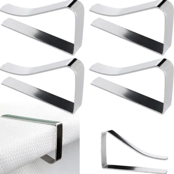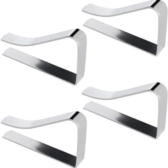 Set med fyra metallklämmor för bordsdukar. De hjälper till att hålla ditt bord organiserat och estetiskt tilltalande. De kommer att vara användbara i alla hem, trädgårdar, terrasser eller balkonger. Oumbärliga vid blåsigt väder under utomhusfester eller picknickar. Klämmorna förhindrar att materialet flyttar sig och skrynklar sig. Tillverkad enligt europeiska standarder.