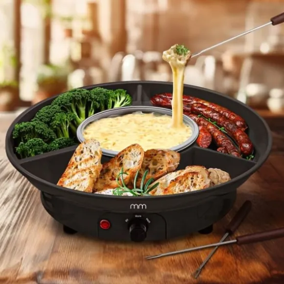 Njut av en speciell stund hemma med vårt elektriska fondueset! Den centrala grytan och de omgivande tallrikarna ger en vacker presentation av färsk frukt, bröd och andra godsaker. Godbitarna kan avnjutas genom att doppa dem i smälta salta eller söta såser. Med en kapacitet på 260 ml är det bra för generösa portioner, och den enkla separationen i två sektioner möjliggör snabb handdisk. Denna uppsättning är perfekt för intima sammankomster, firanden eller för att helt enkelt unna sig själv något. Den innehåller 2 gafflar och har en uppvärmningsfunktion för att uppnå den perfekta konsistensen för dina dippar och en uppvärmningsfunktion för att hålla den varm.