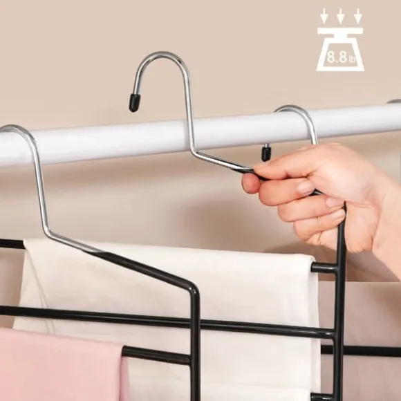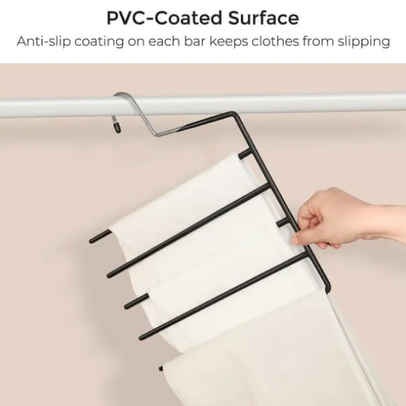 Dessa platsbesparande byxgalgar är utformade för att effektivt organisera din garderob genom att hålla flera par byxor på en enda galge. Deras halkfria beläggning säkerställer att dina plagg hålls säkert på plats, vilket gör dem idealiska för byxor, slipsar, scarfar och andra accessoarer.