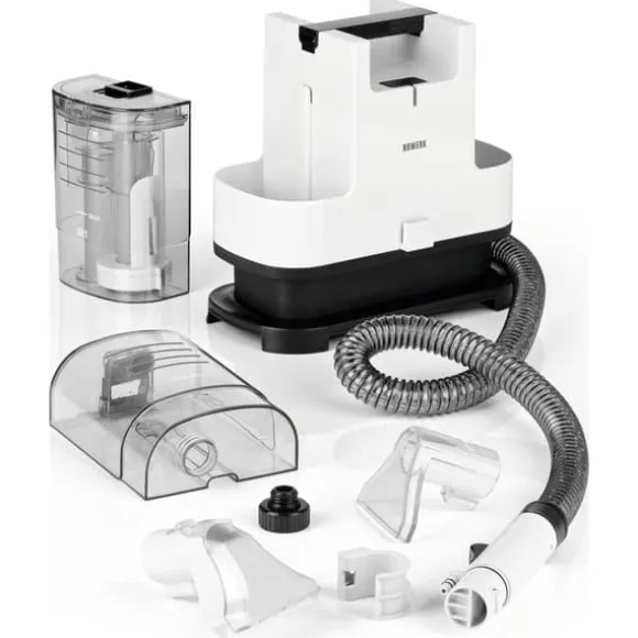 - Rengöringsenhet med sugslang, Smutsvattentank, Färskvattentank, Mattrengöringsmunstycke med borste, Bruksanvisning