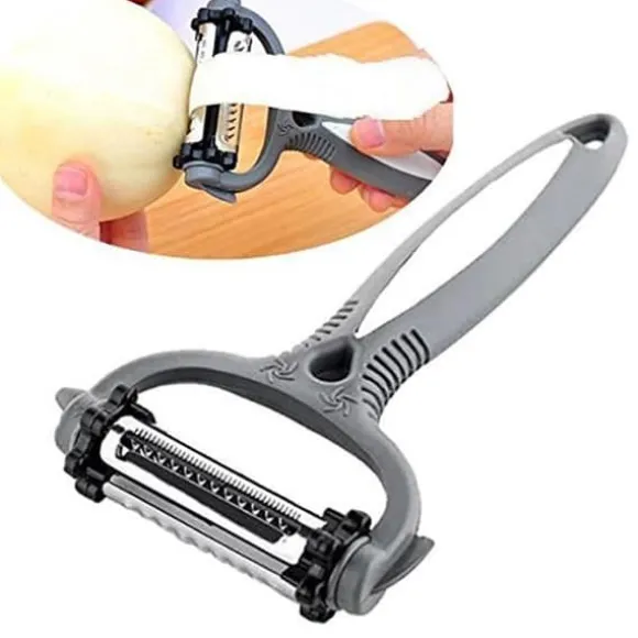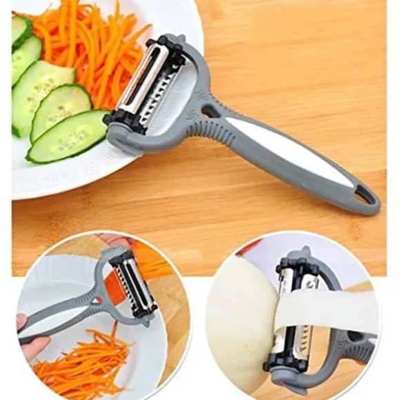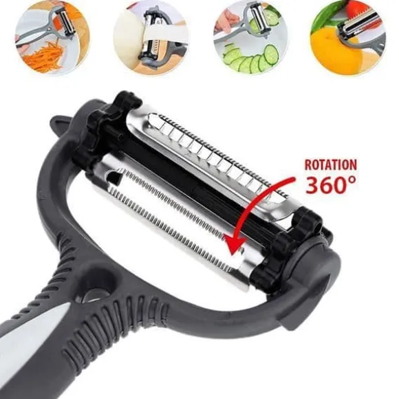 Den här 4-i-1 julienne-skalen från Net Solutions har tre dubbelsidiga, vassa och hållbara blad i rostfritt stål. Det ergonomiska handtaget passar både höger- och vänsterhänta för enkel kontroll vid skalning. Den gör det möjligt att skala, skiva, skära i remsor, zesta och riva för professionella resultat.